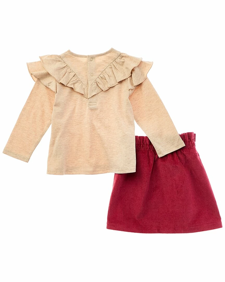 - 2pc Top & Skirt Set in beige/red with ruffled top and accompanying corduroy skirt with elastic paperbag waist and dual front pockets