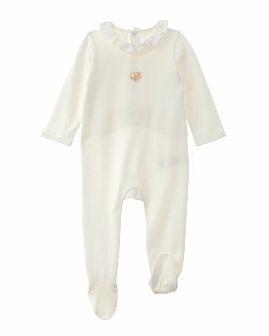 - Bodysuit in white with ruffled collar and embroidered detailing