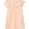 - Dress in beige with embroidered detailing and scalloped ruffle trim