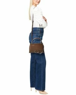 - Faye Small Leather Shoulder Bag in brown leather with gold-tone hardware and ring and chain accent