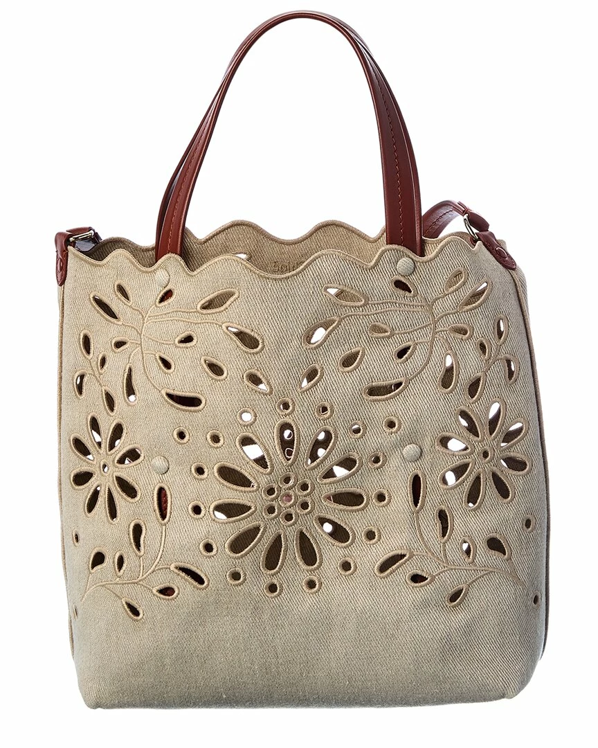 - Kamilla Small North/South Canvas & Leather Tote in natural canvas and brown leather and gold-tone hardware with eyelet detailing and scalloped trim