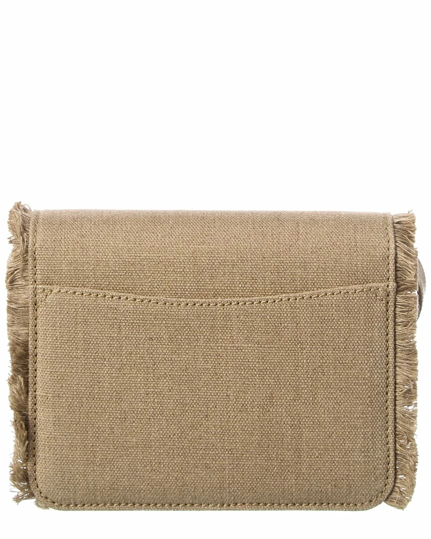 - Kattie Canvas Shoulder Bag in natural canvas and gold-tone hardware with fringe trim and exterior pocket