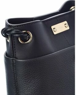 - Key Small Leather Bucket Bag in black leather and gold-tone hardware with logo plaque and rope shoulder strap