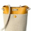 - Key Small Linen & Leather Bucket Bag in natural linen and burgundy leather and gold-tone hardware with logo plaque and rope shoulder strap