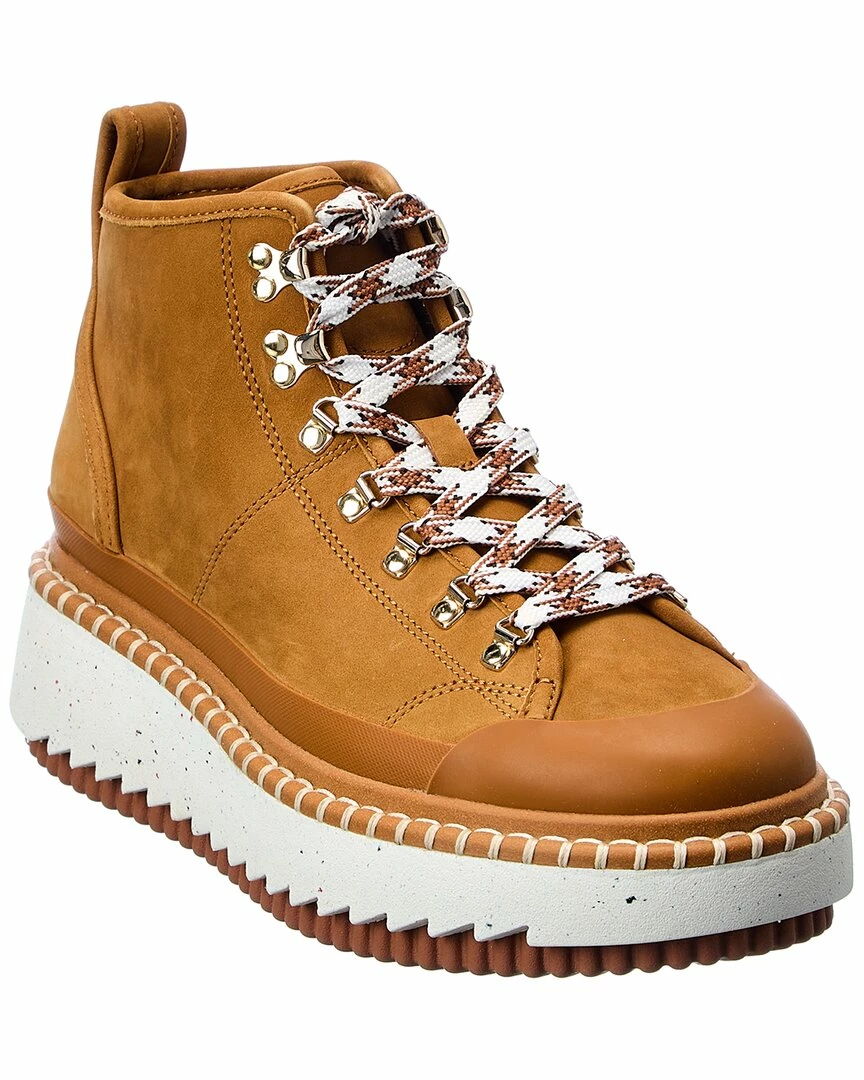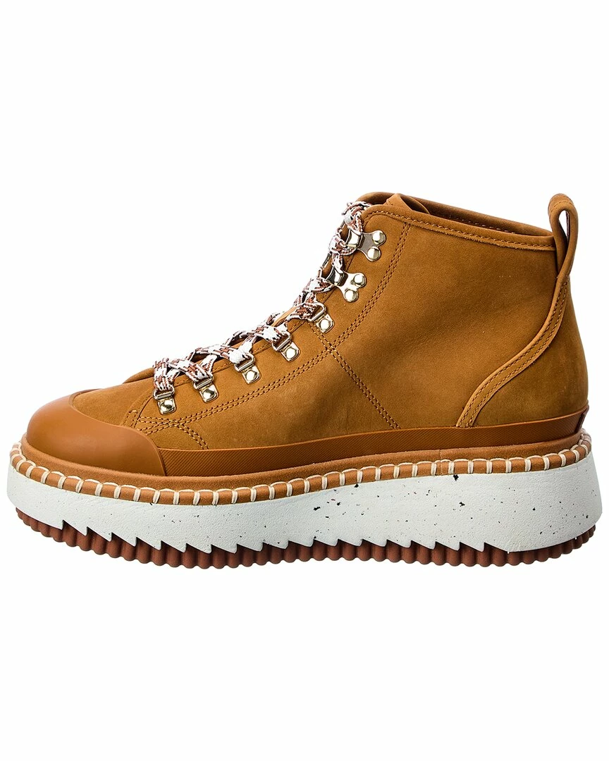 - Lilli Suede Bootie in Autumnal brown suede and gold-tone hardware with patterned laces and zigzag sole