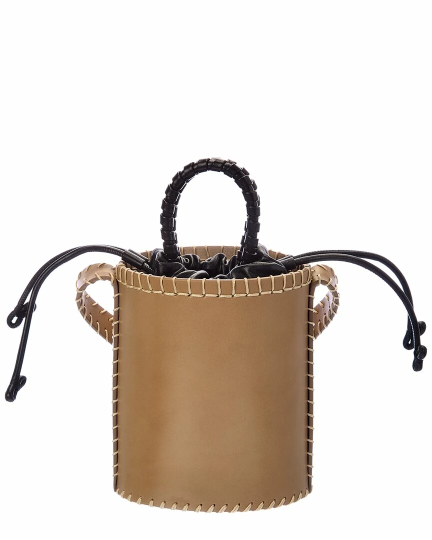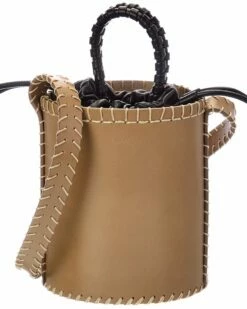 - Louela Mini Leather Bucket Bag in greyish taupe leather with gold-tone hardware and whipstitch detailing