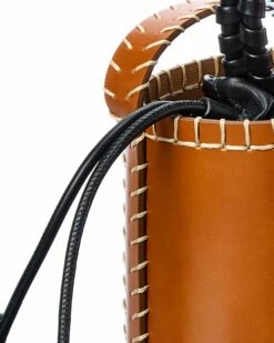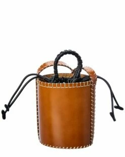 - Louela Mini Leather Bucket Bag in tan and black leather with gold-tone hardware and whipstitch detailing