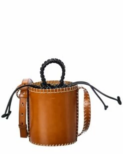 - Louela Mini Leather Bucket Bag in tan and black leather with gold-tone hardware and whipstitch detailing