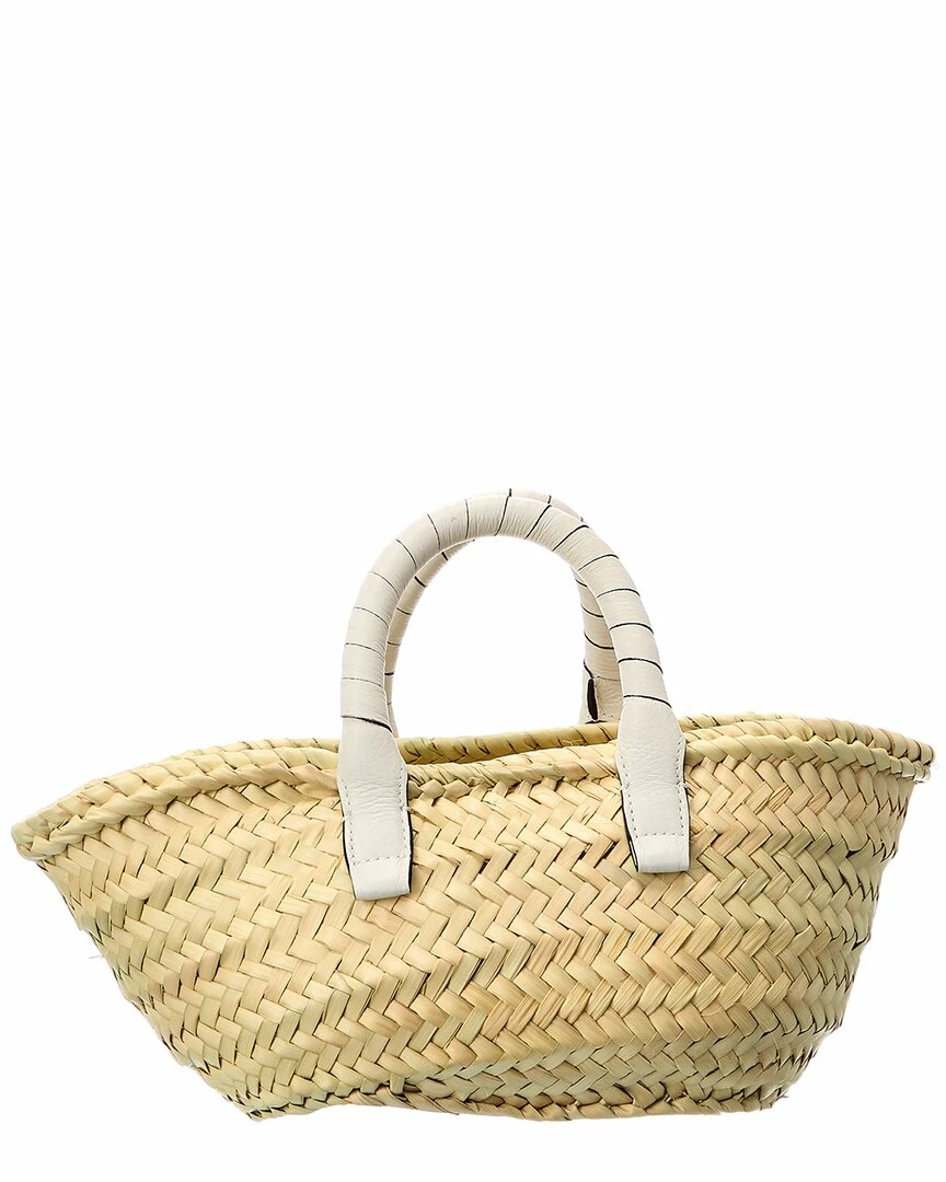- Marcie Mini Raffia & Leather Basket Tote in natural raffia and white leather and gold-tone hardware with exterior flap pocket