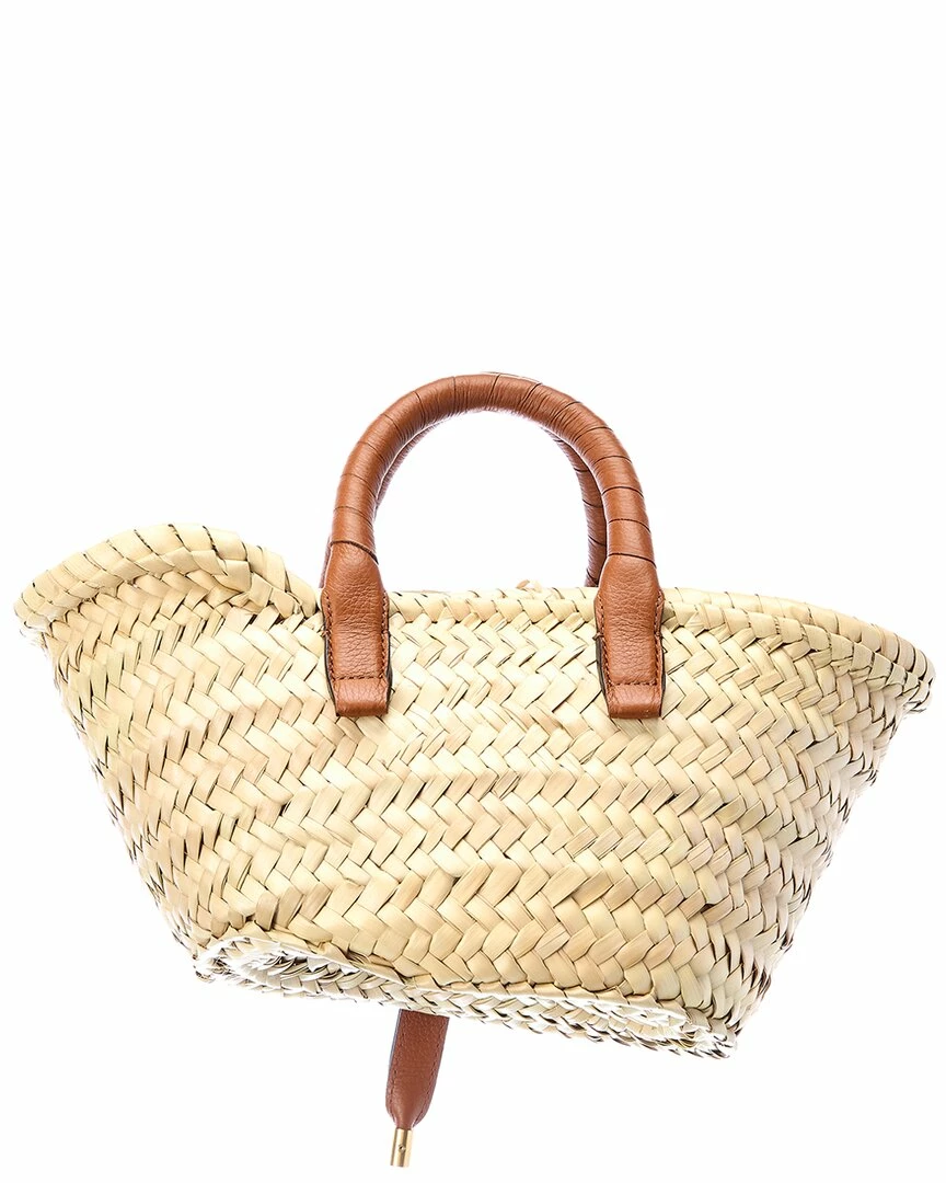 - Marcie Mini Raffia & Leather Tote in natural raffia and tan leather with gold-tone hardware and fold-over flap