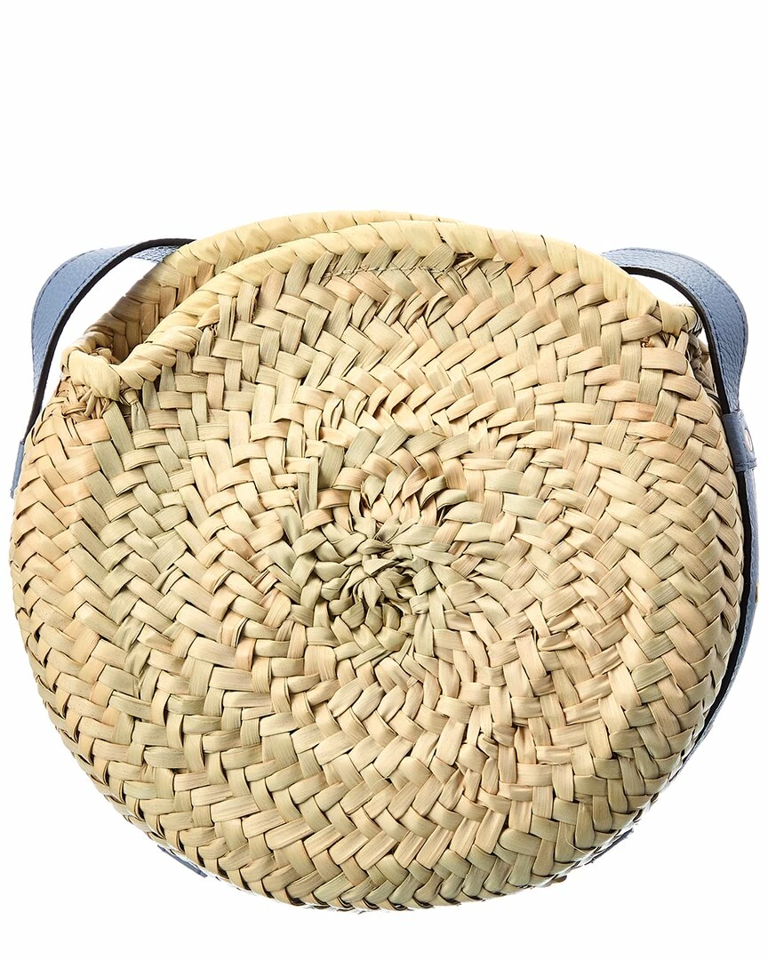 - Marcie Small Raffia & Leather Basket Crossbody in natural woven raffia and blue leather with gold-tone hardware and flap pocket
