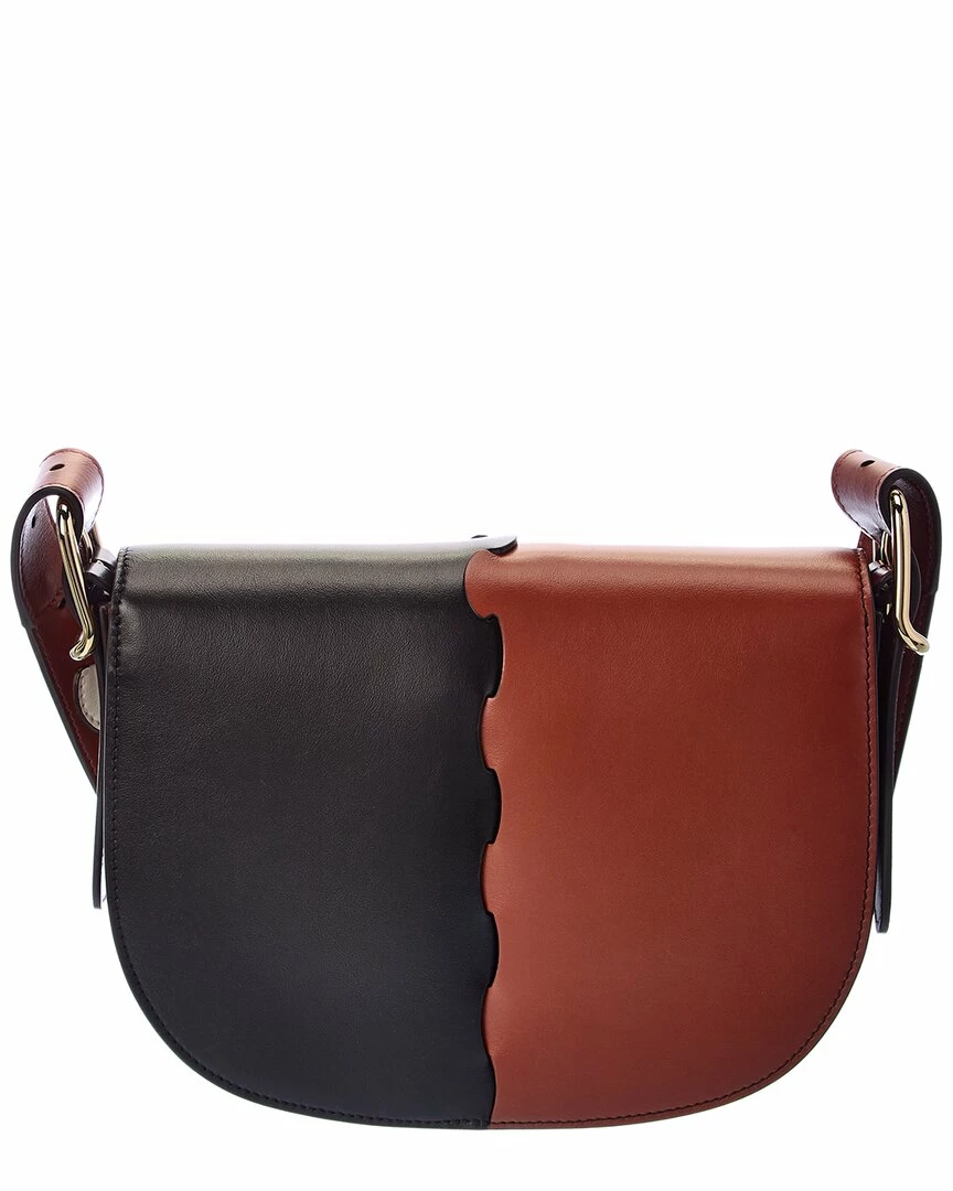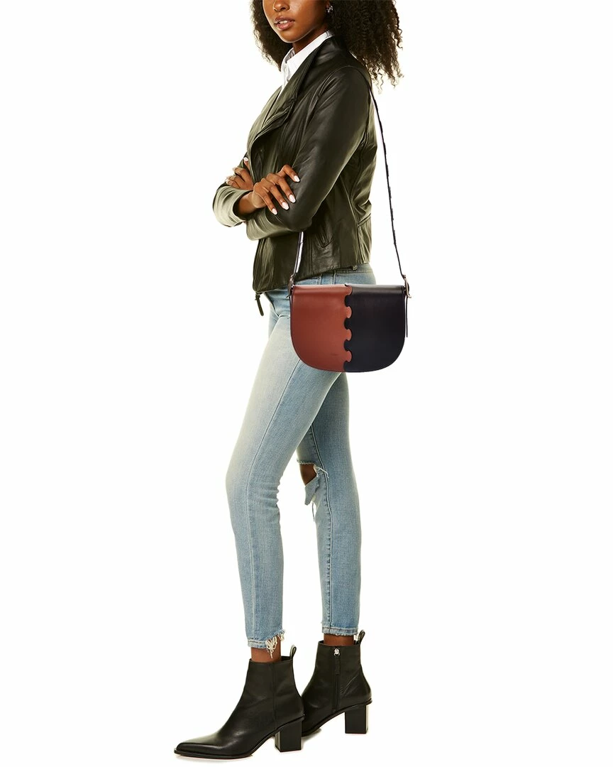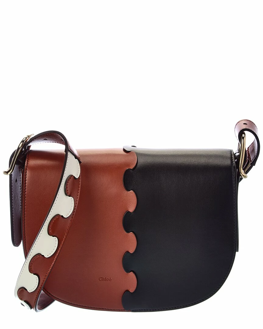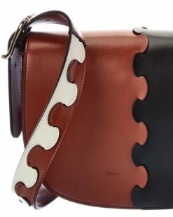 - Mia Leather Saddle Bag in brown and black leather with gold-tone hardware and 3D puzzle effect
