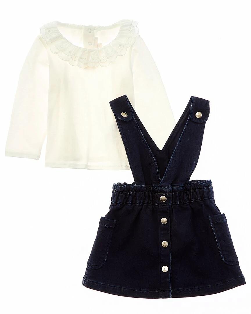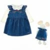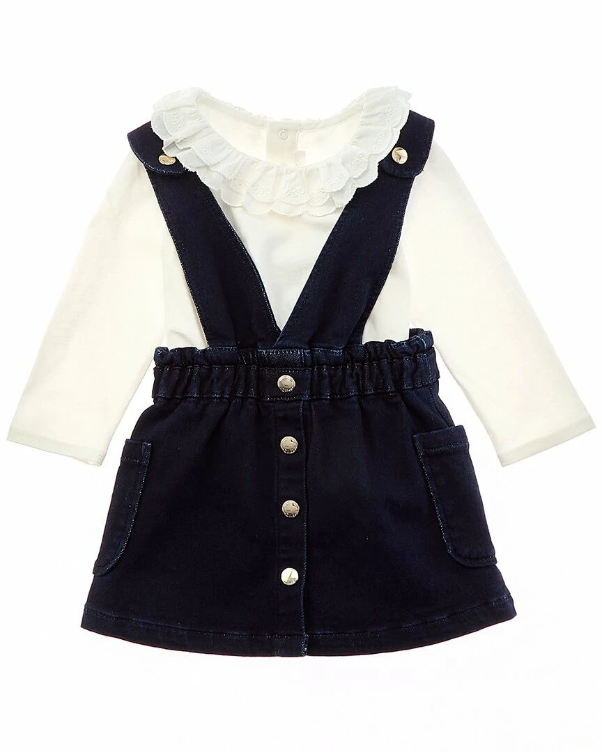 - Overall Dress in denim with elasticized waist, dual side pockets and accompanying t-shirt with ruffled collar
