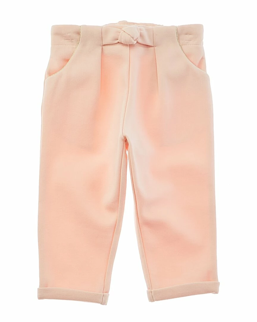 - Pant in pink with elasticized waist with knot accent, dual front pockets, metallic trim and rolled hem