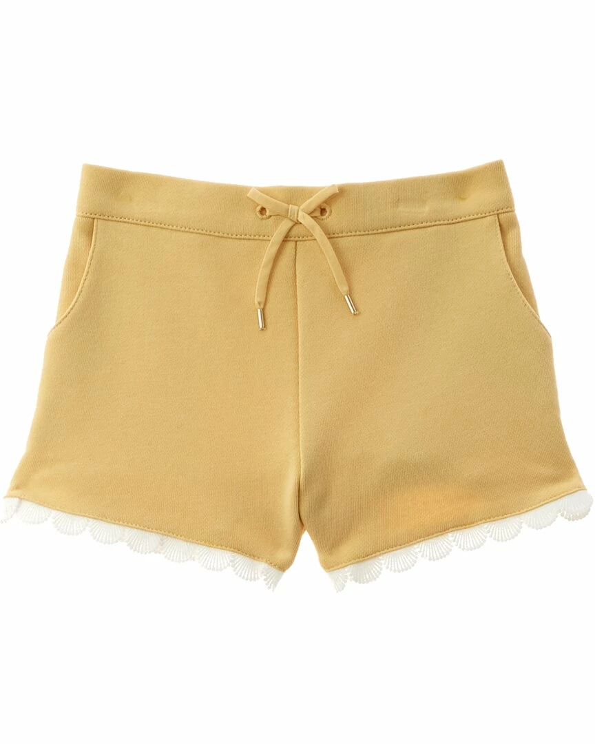 - Short in yellow with elasticized waist, two front pockets and scalloped hem