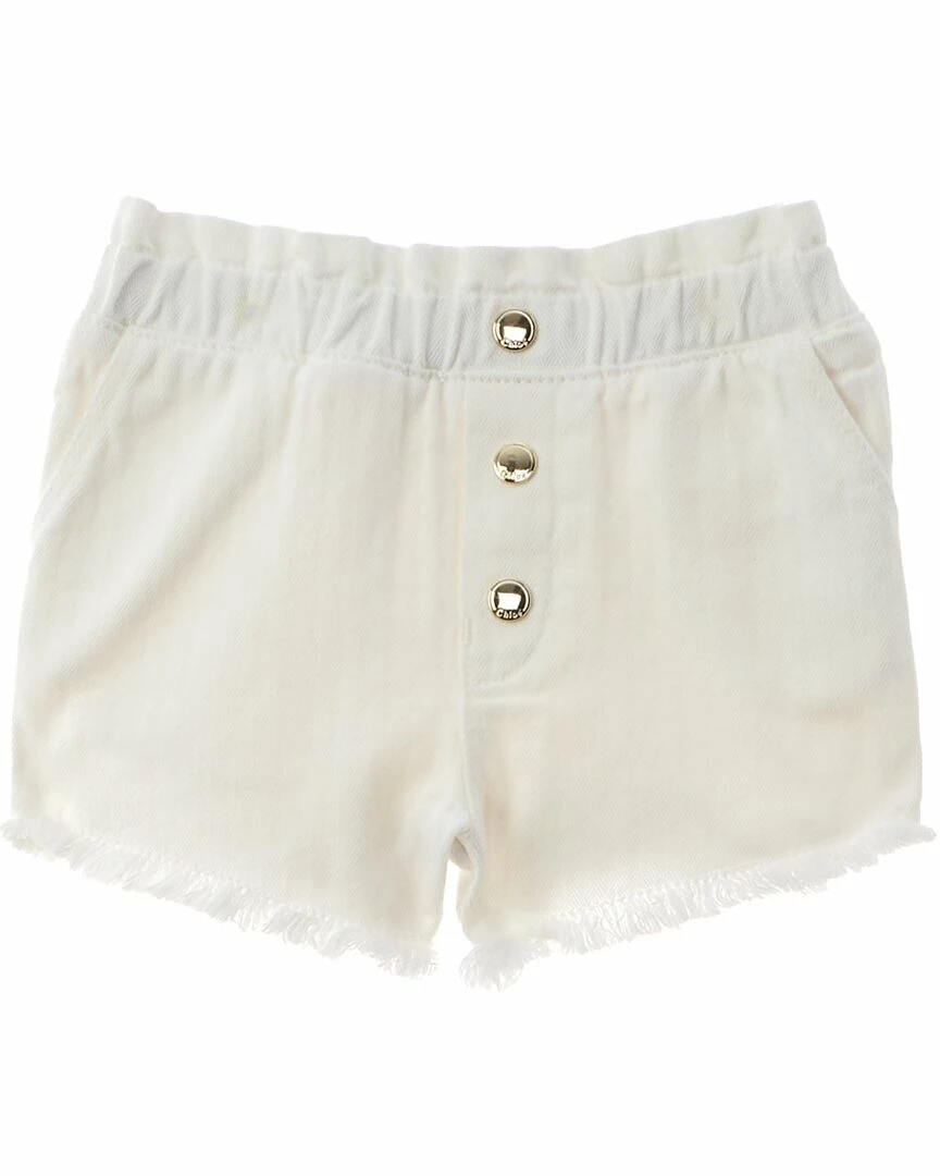 - Short in white with elasticized waist, faux button fly, four-pocket styling and frayed hem