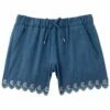 - Short in chambray with elasticized waist with self-tie detail, two front pockets and scalloped hem