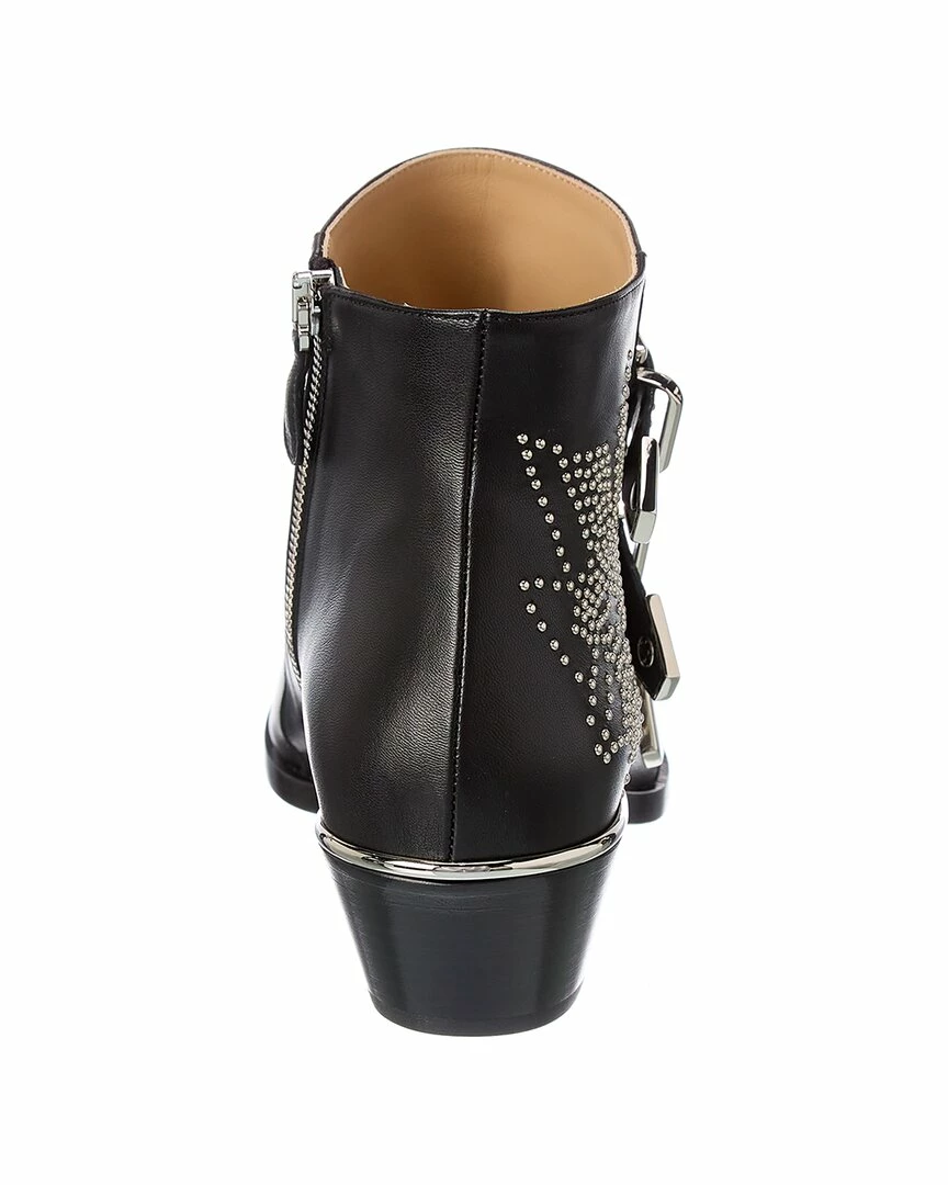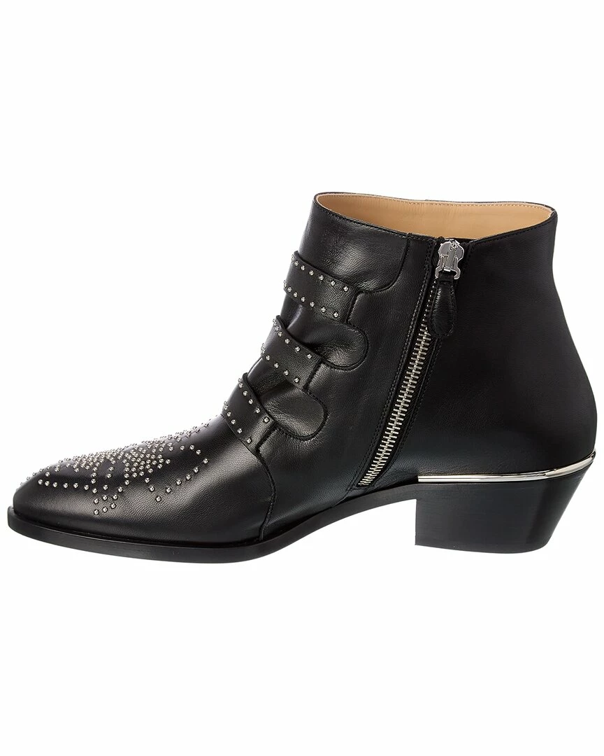 - Susanna Studded Leather Bootie in black leather and silver-tone hardware with buckle accents and stud embellishments