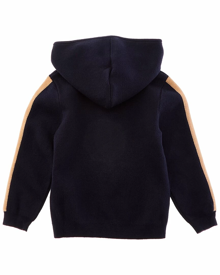 - Wool-Blend Jacket in navy with hooded back, divided kangaroo pocket and ribbed trim